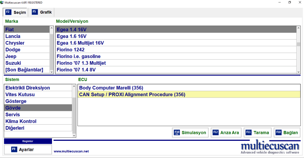 Öncelikle ELM327 cihazımızı aracımıza bağlıyoruz. Arabanın anahtarını MAR konumuna getirip bilgisayarda Multiecuscan programını çalıştırıyoruz. Görselde görüldüğü üzere türkçe bir menümüz var. Marka kısmından ”Fiat” seçtikten sonra model kısmından ”Egea” seçiyoruz. Bu kısımda araç motor hacmi ve cinsini aracınıza göre seçmeniz gerekiyor. Asıl işleme başlamadan önce aracımızda bulunan arızaları silmemiz gerekiyor. Arıza ara kısmını seçiyoruz ve tüm sistemi taramasını bekliyoruz. Eğer arıza çıkarsa arızaları siliyoruz. Daha sonra sistem kısmında ”Gövde” , ecu kısmında ise CAN Setup/Proxi seçip bağlan diyoruz.