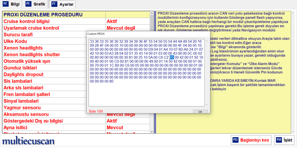 Değişikliğin etkin olması için ”OK” seçerek sağ altta bulunan ”İşlet” seçeneğini tıklıyoruz. Bu işlem sırasında araç ekranında arıza sembolleri yanıp sönecek stres yapmayın sorun yok 🙂 Bir süre sonra ekranda ”Mavi Kablo Bağlayın” seçeneği gelecek . Bu aşamada ELM327 cihazımızda bulunan mod değiştirme tuşunun yönünü değiştirip klavyemizde ”Y” tuşuna basıp devam ediyoruz. Eğer proxi hizalama sorunsuz biterse en sonunda kontağı kapatın uyarısı gelecek ve işlem tamamlanmış olacak.